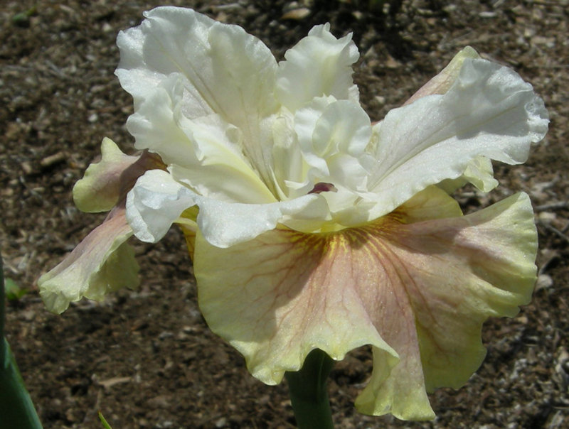 Сильные многочисленные цветоносы достигают около 60 сантиметров в высоту. На каждом завязывается около 5-7 бутонов, обеспечивающих обильное цветение. Нижние гофрированные лепестки персиково-лиловые, с бордовыми яркими прожилками. Верхние – кремовые с нежно-желтой окантовкой. Цветение – в июне. Узкие листья длинные, плотные, зеленого цвета. Срезанные цветы хорошо смотрятся в букетах.