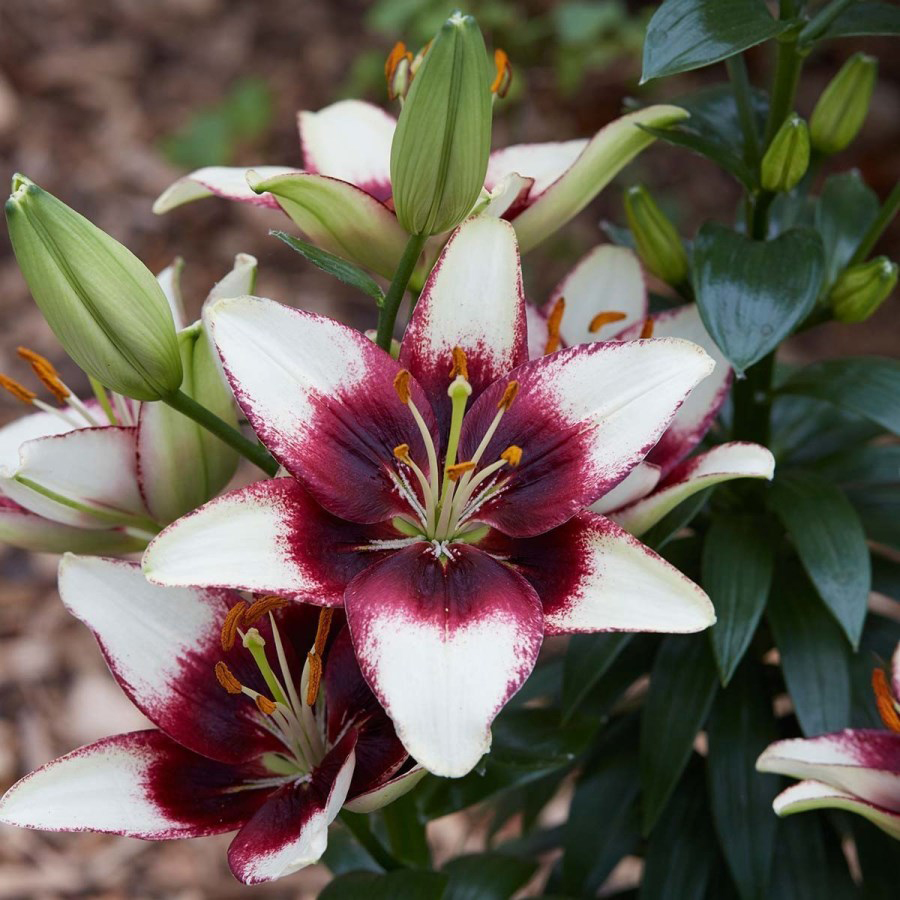 Луковицы Лилии азиатской Куритиба (Lilium asiatic Curitiba) относятся к низкорослым сортам. Взрослое растение не превышает высоты 60-70 см, однако может стать настоящим украшением сада благодаря крупным, до 17 см в диаметре, цветкам и их удивительной контрастной расцветке. Цветок с нежно-кремовыми лепестками в центре имеет насыщенно-винный цвет и узкую окантовку. Красавицу Куритиба можно смело отнести к одним из самых эффектных декоративных сортов лилий, привлекающих внимание своей «смелой» окраской. Подойдет как для одиночной, так и для групповой посадки.