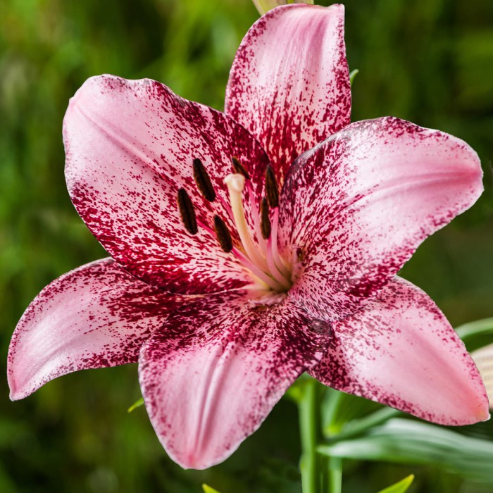 Окраска цветка : крупный, перламутрово-розовый с редким бордовым напылением по краям лепестков и у центра, пыльники темные