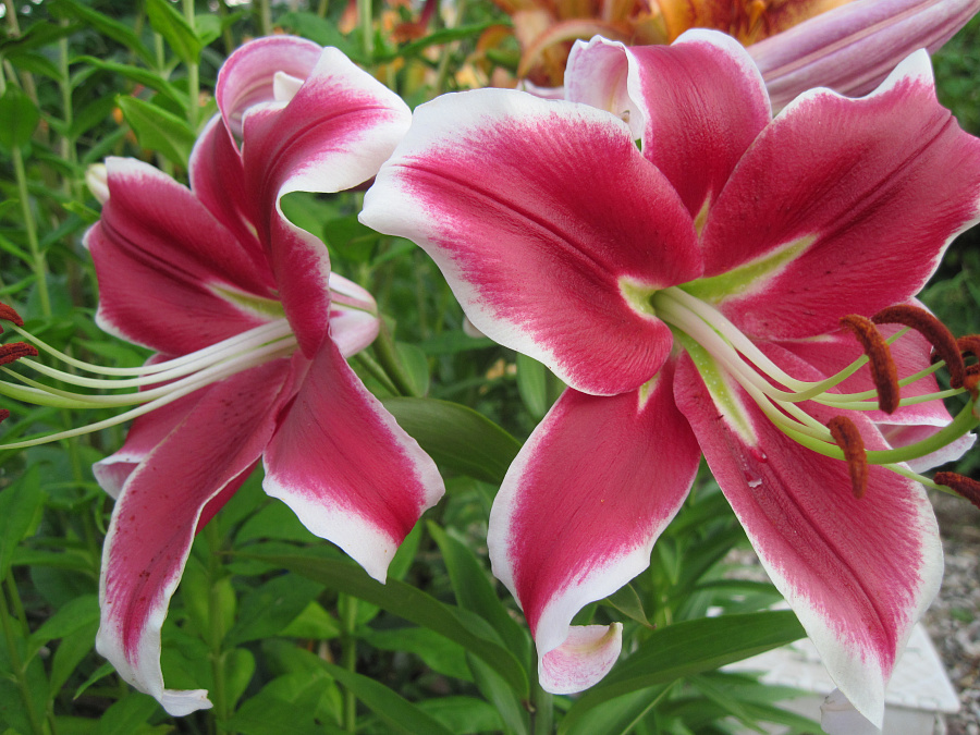 Лилия от-гибрид Flashpoint - это великолепное растение с темно-розово-винными цветками, украшенными кремово-белой каймой и желто-зеленой "звездочкой" в центре. Ее широкие, волнистые лепестки создают неповторимый вид, который поражает своей красотой. Высота растения достигает 120 см, а размер цветка составляет 15-18 см, что делает его заметным акцентом в саду.